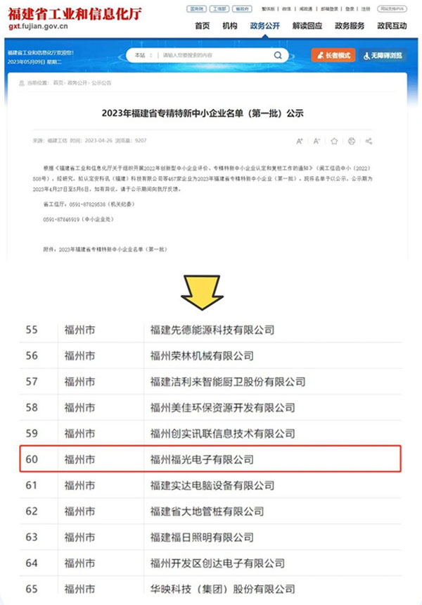 12月4日,福(fú)建省工業和信息(xi)化廳發布《2023年福建(jian)省專精特新中小(xiǎo)♋企業名單(第一批(pi))公示》,福州福光電(dian)子有限公⛹🏻♀️司順利(lì)通過審核并且完(wan)成公示,被評爲福(fú)建省“專精特新中(zhōng)小企業”和“創新型(xing)中小企✨業🌐”兩⛹🏻♀️項殊(shū)🔞榮